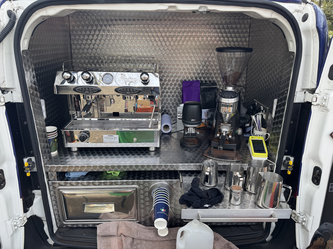 | Massimo Mazzeo, who trades as ‘The Italian Coffee Guy’ serves customers drinks in a car park in Horsham, March 20, 2026. Maz, as he likes to be known, made the decision to give up the corporate lifestyle when his father died in 2021, realising that he wanted a different life. He decided to follow his passion for coffee, went to Italy and bought a Piaggio Ape, a 3 wheeled light commercial vehicle, in January 2022 and started trading in July 2022. He says that he loves his work and the freedom it gives him, meeting people and working in the community. He added that the local Horsham council have really helped him as a small business and it’s only poor weather that he struggles with as it affects his business. |
