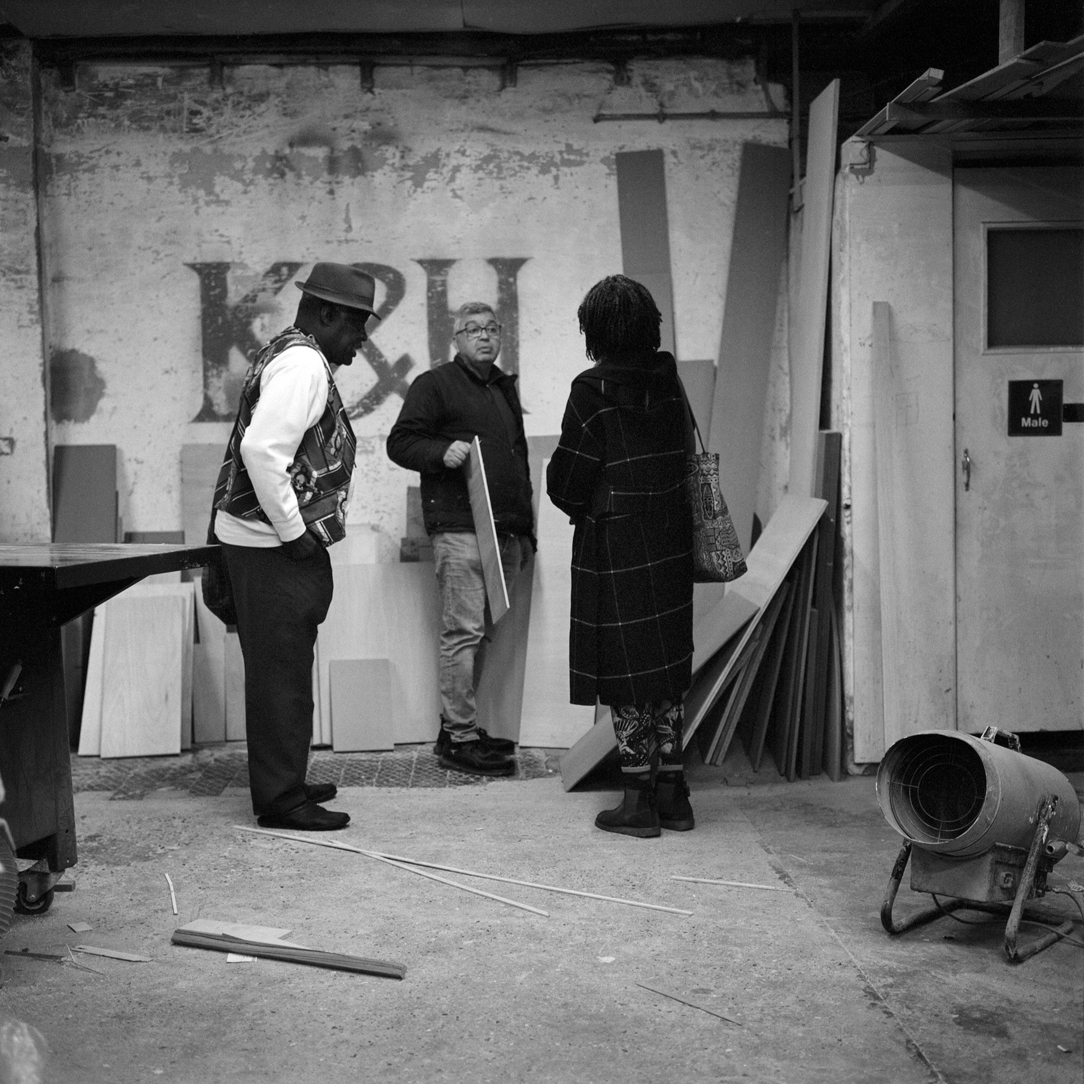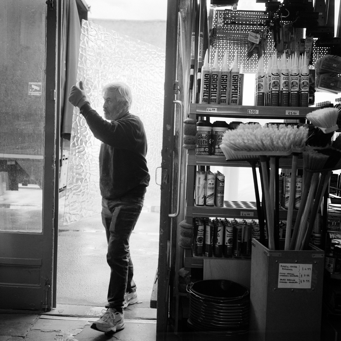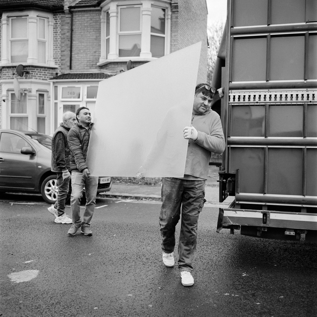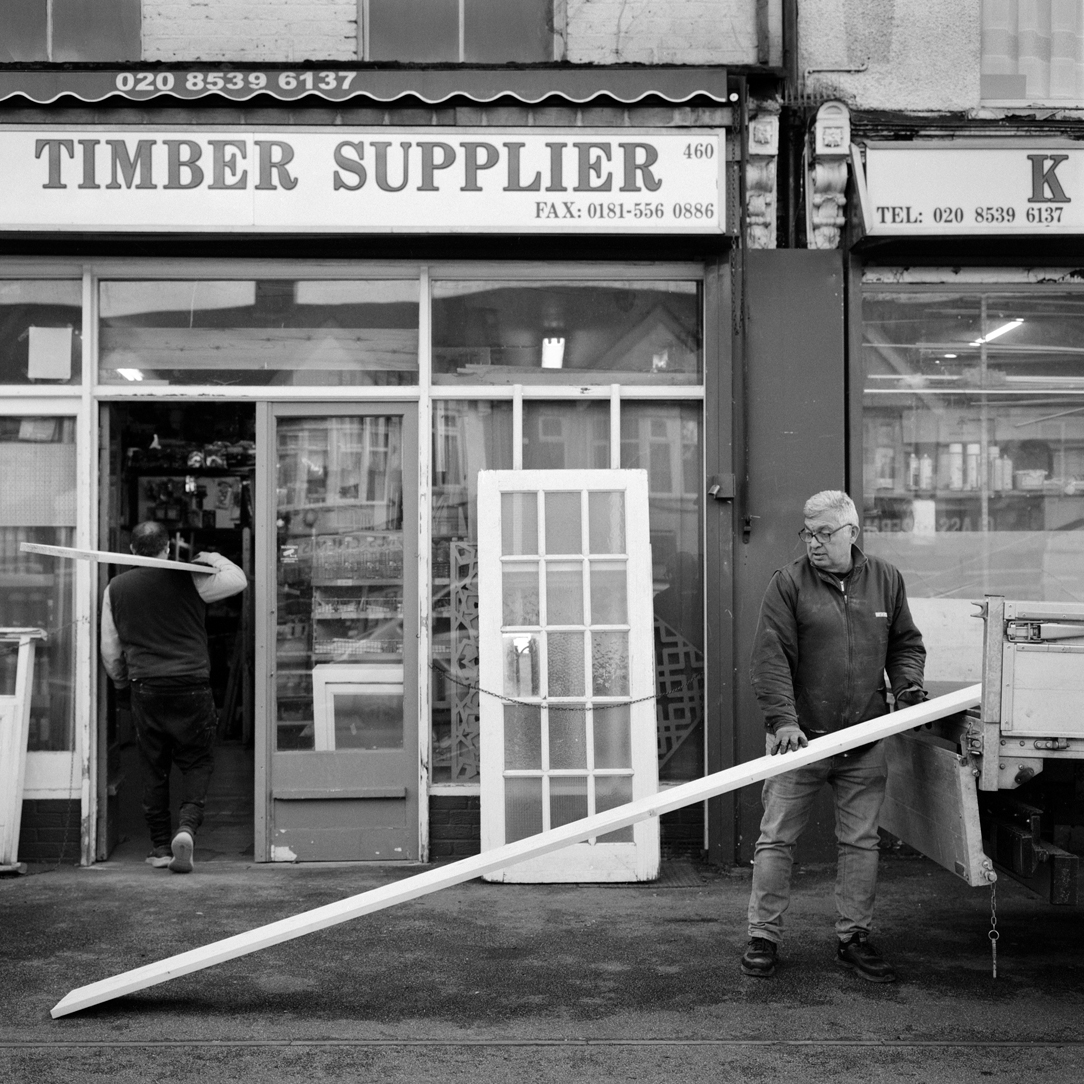 | Kashif and ‘glassman’ Jiva Singh carry sheet glass into the workshop of K&H Timber Supplier on the corner of Lea Bridge Road from a delivery lorry. | ||||