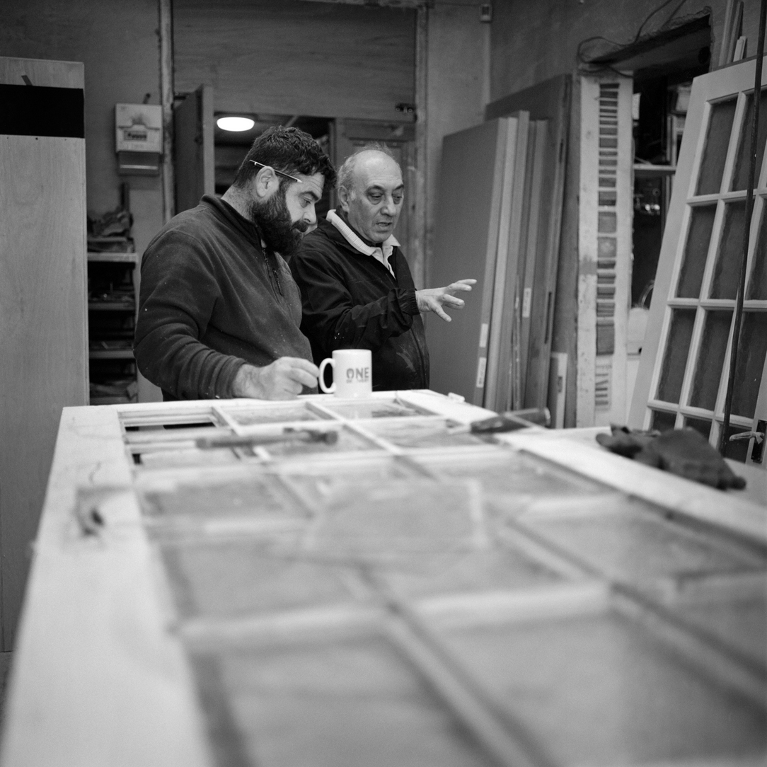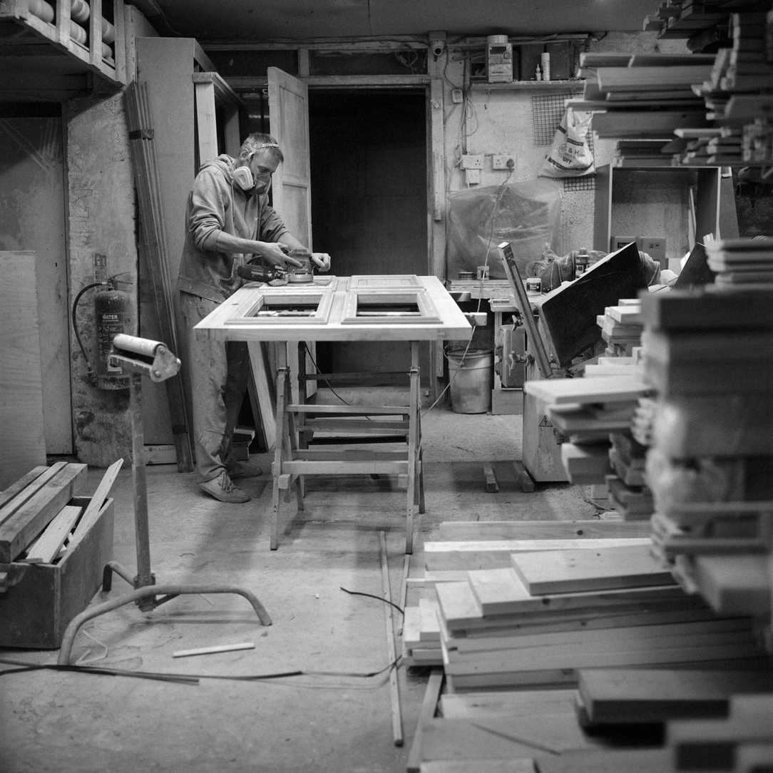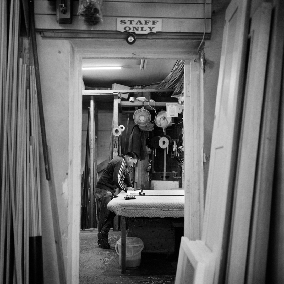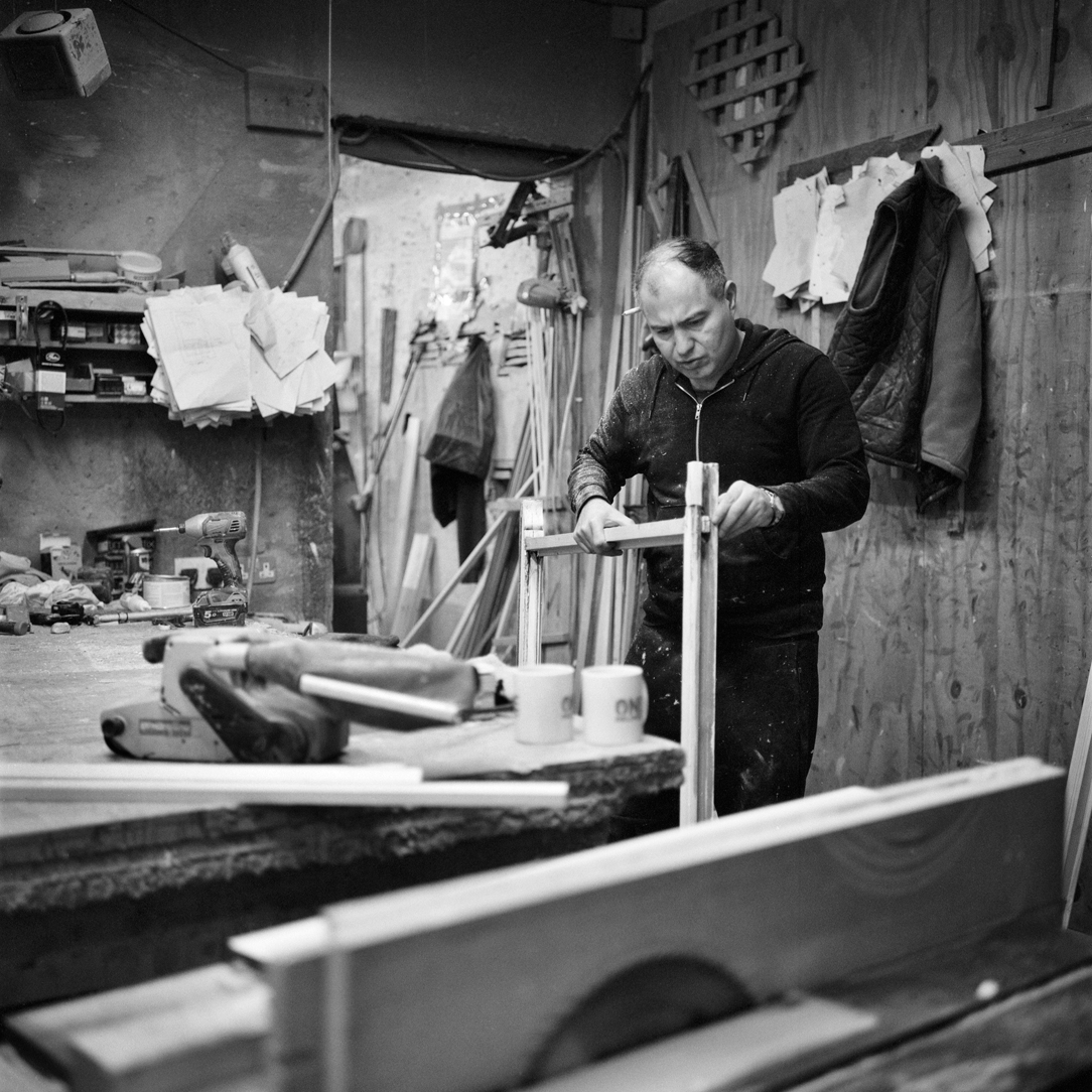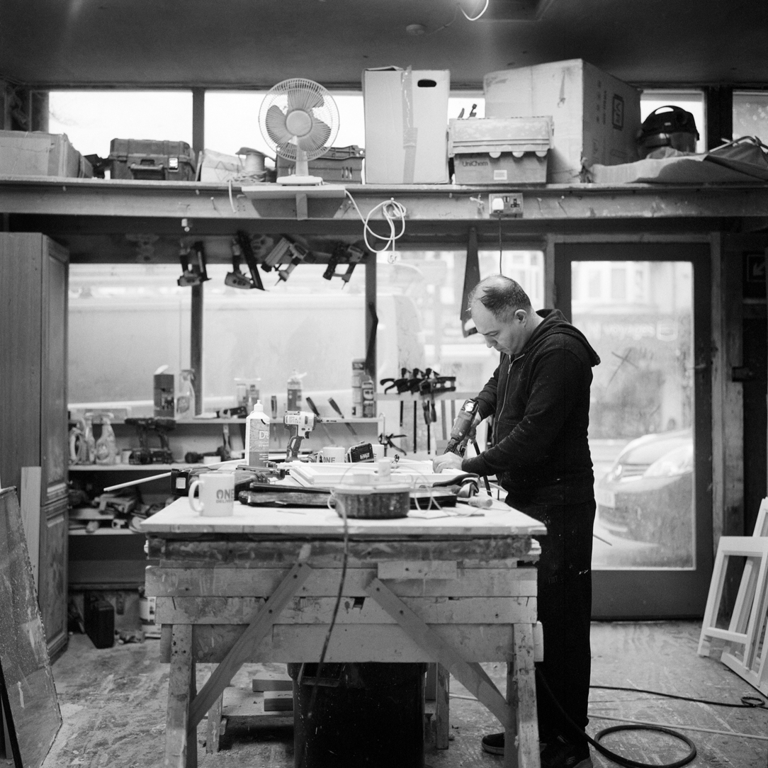 | Joiner Faik Ibik works on a window frame in the front workshop that looks out onto Lea Bridge Road. | ||||
