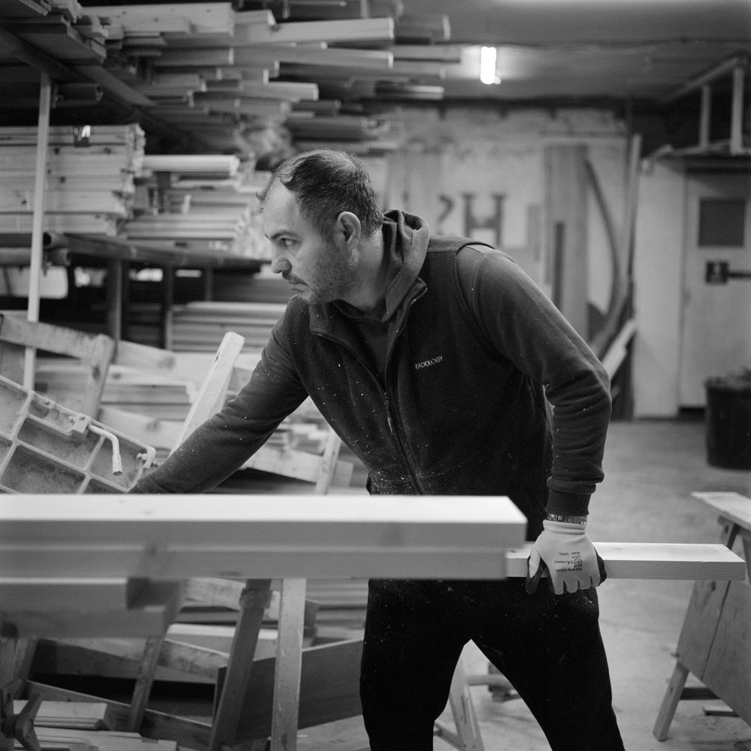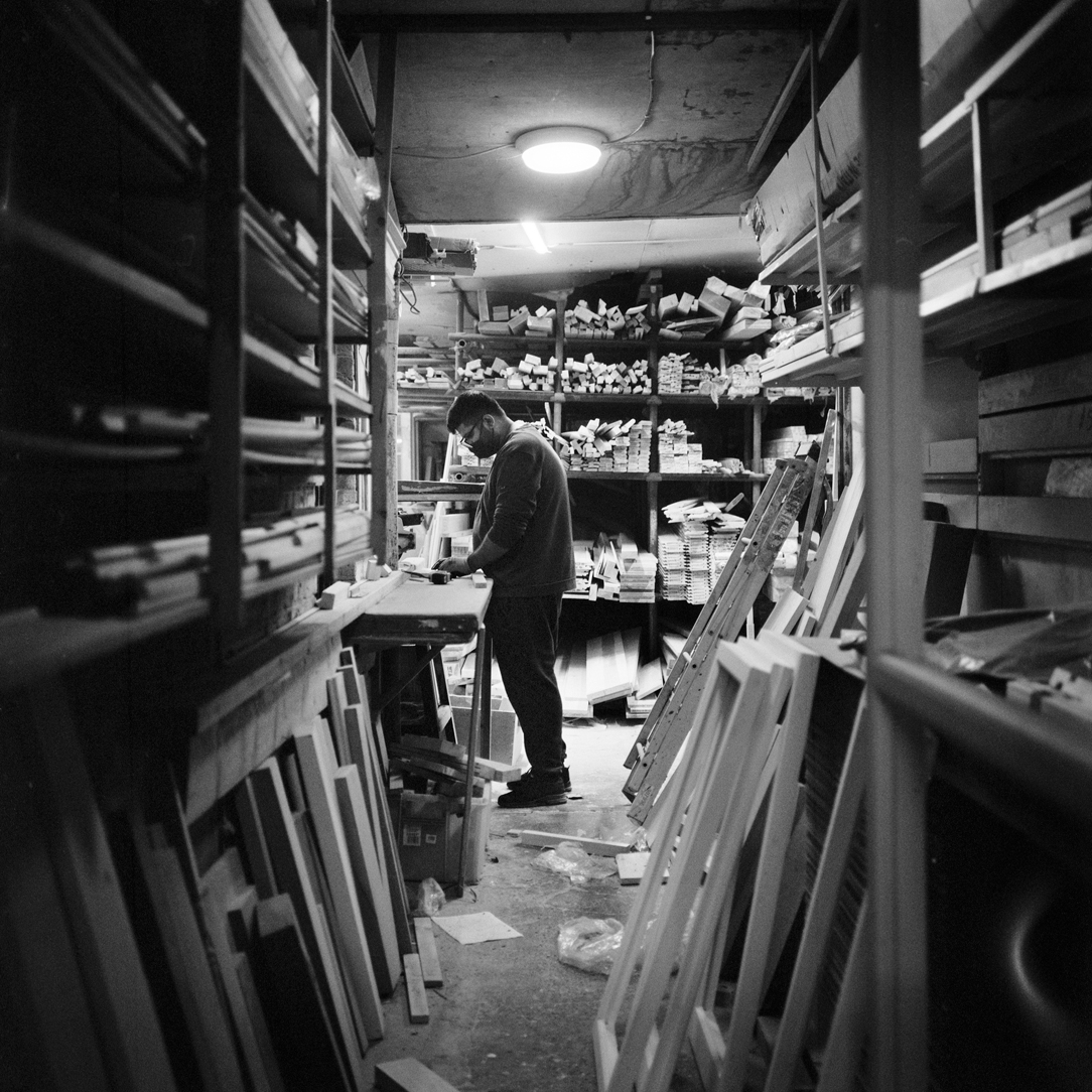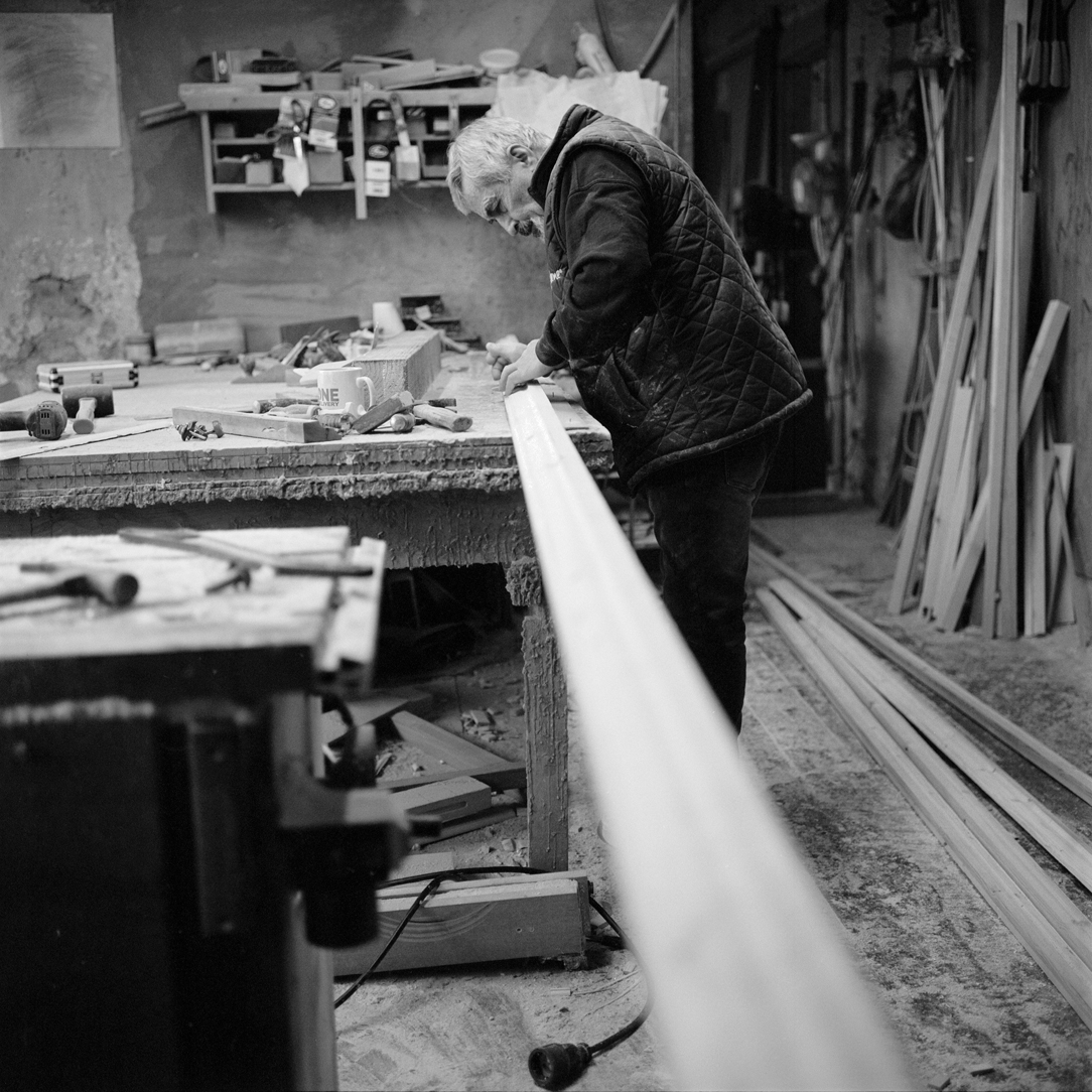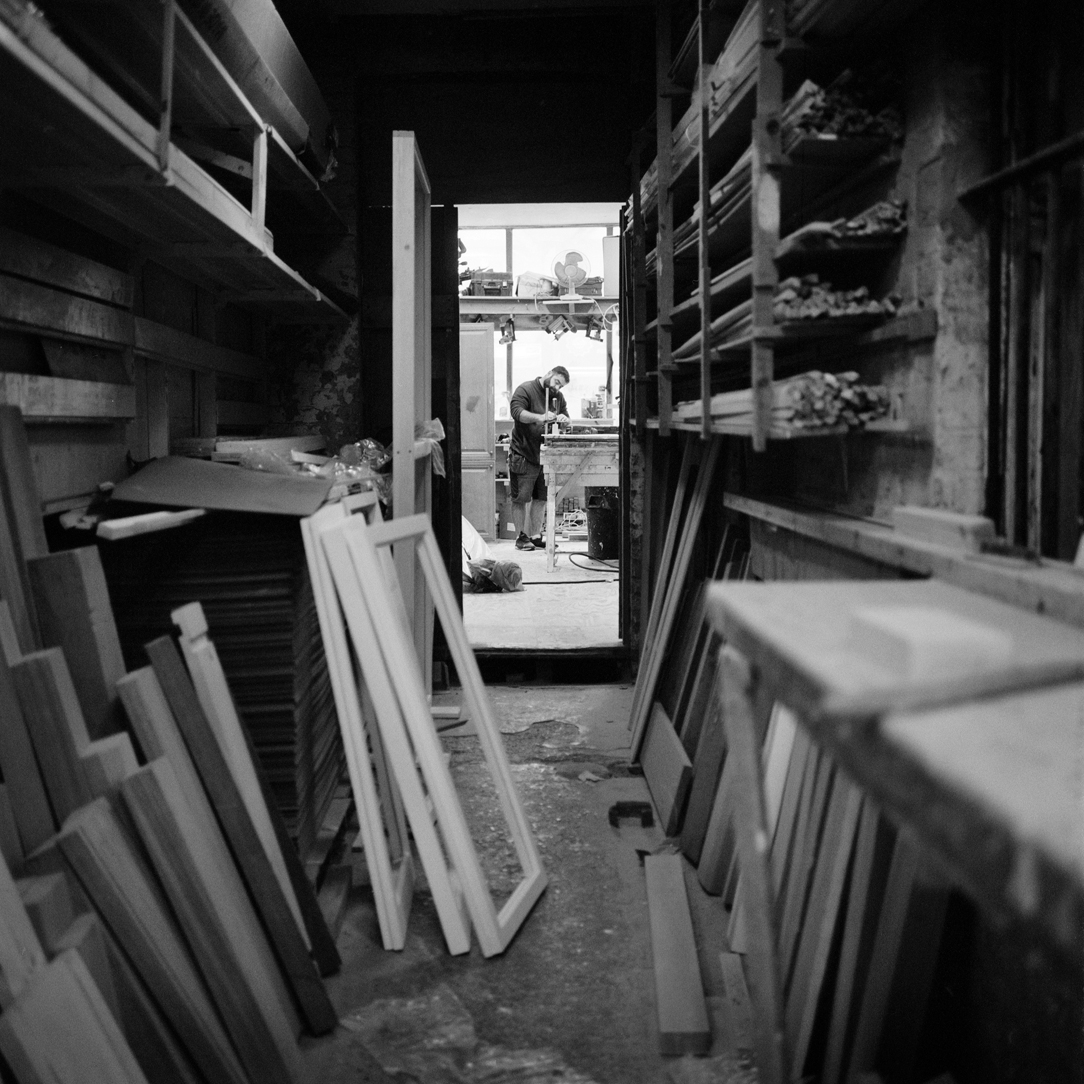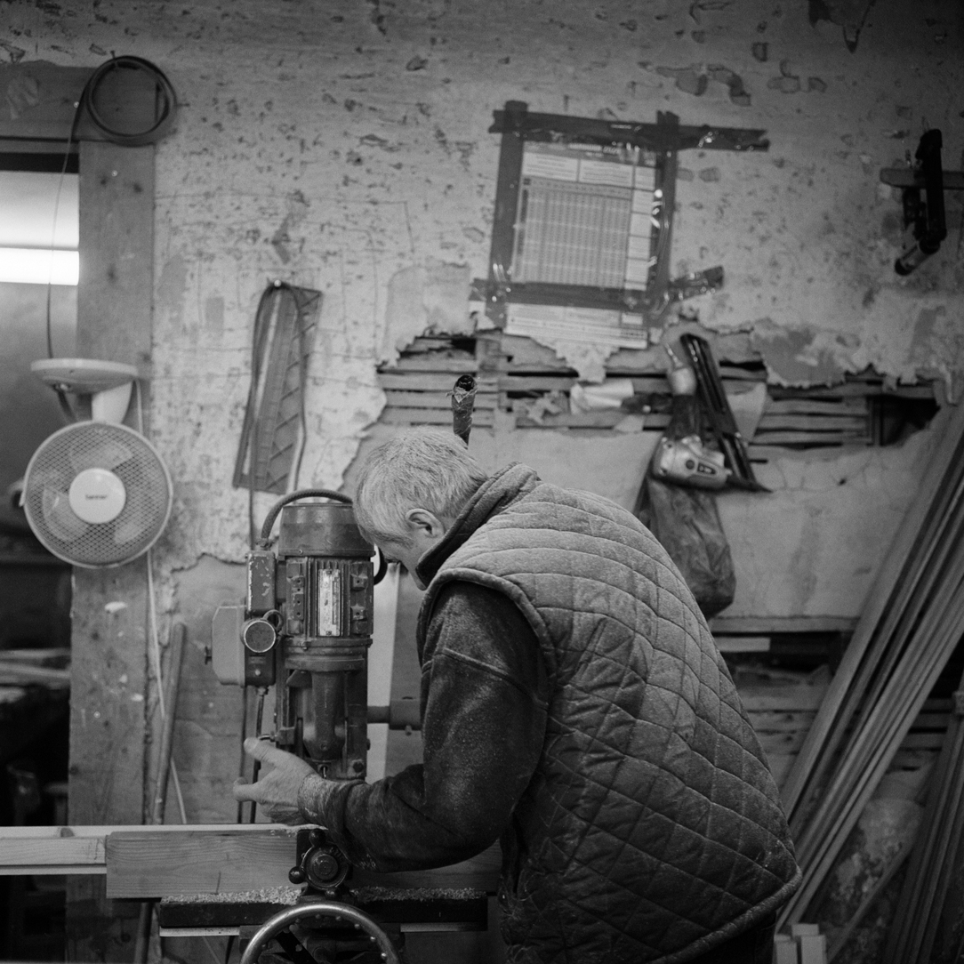 | Joiner Faik Ibik works on a window frame in the front workshop that looks out onto Lea Bridge Road. | ||||