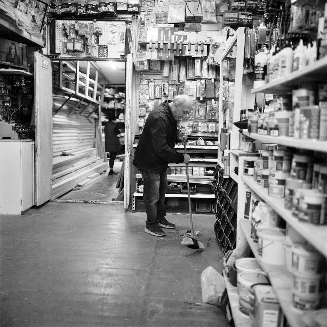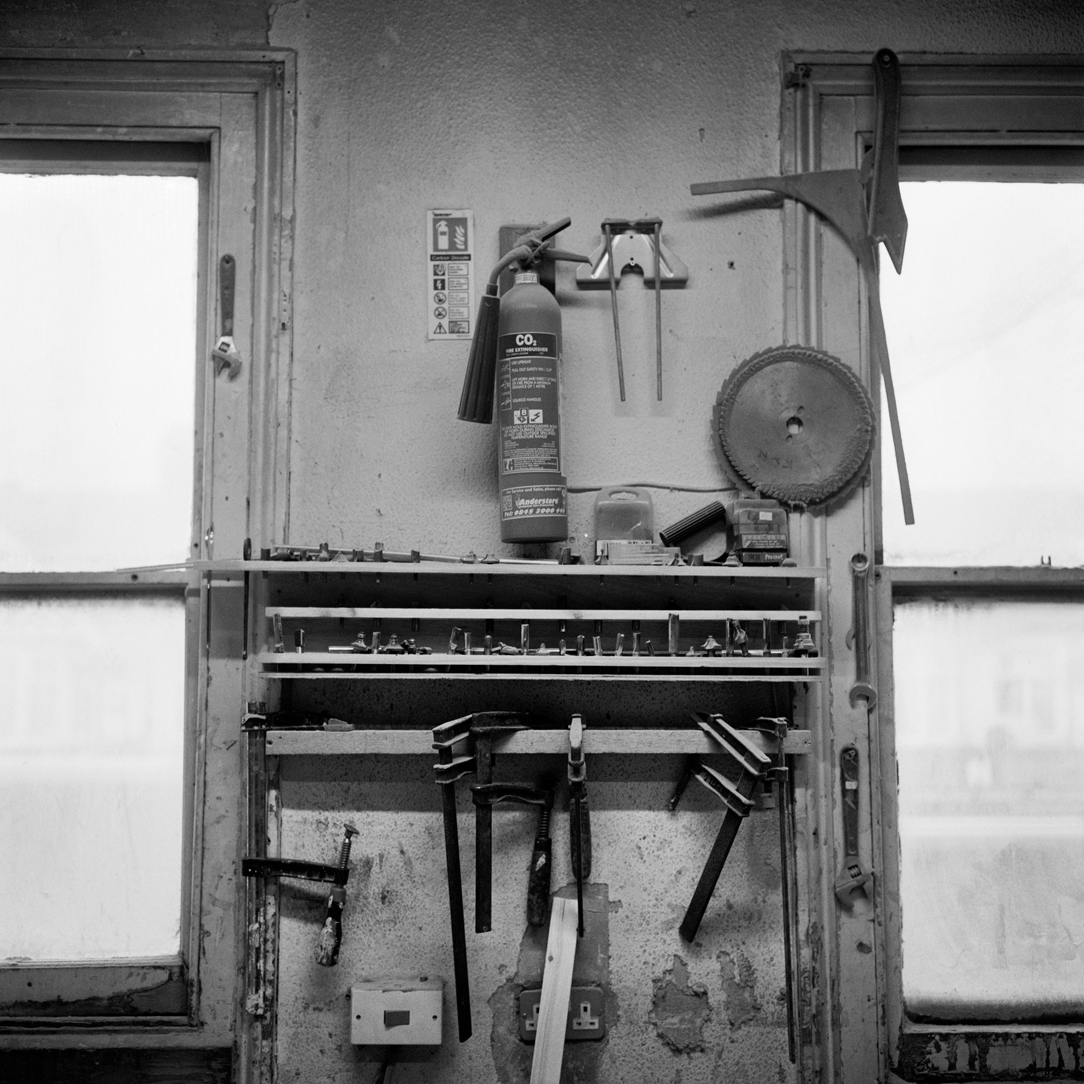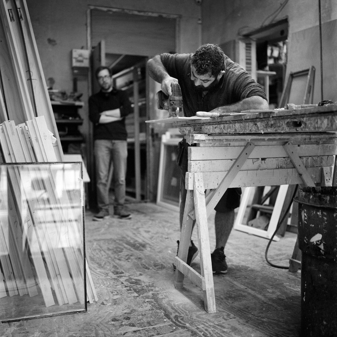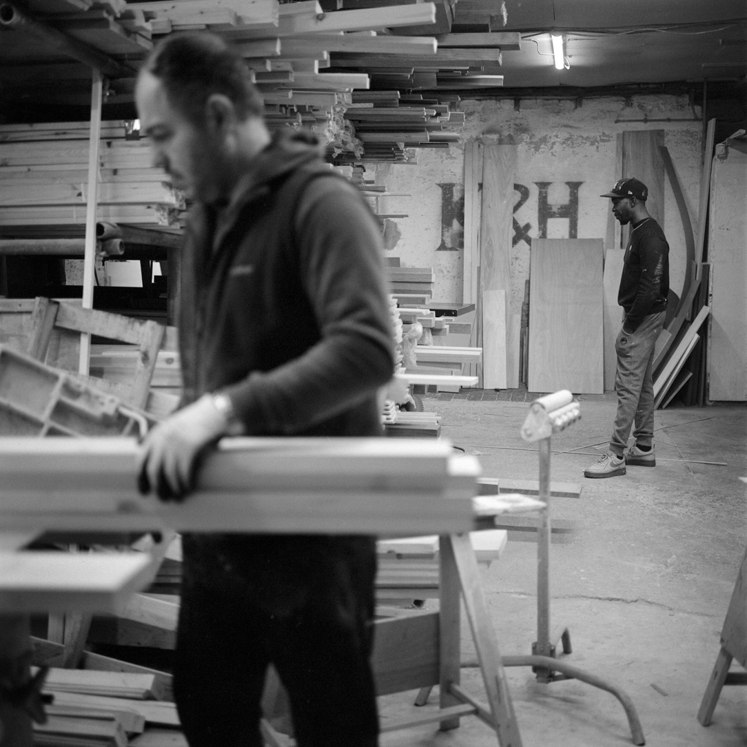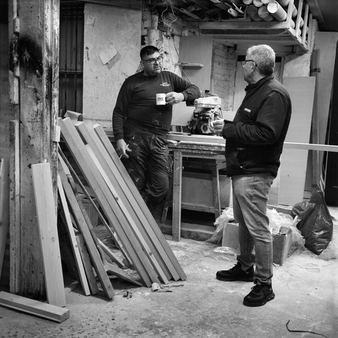| Joiner Faik Ibik works on a window frame in the front workshop that looks out onto Lea Bridge Road. | ||||