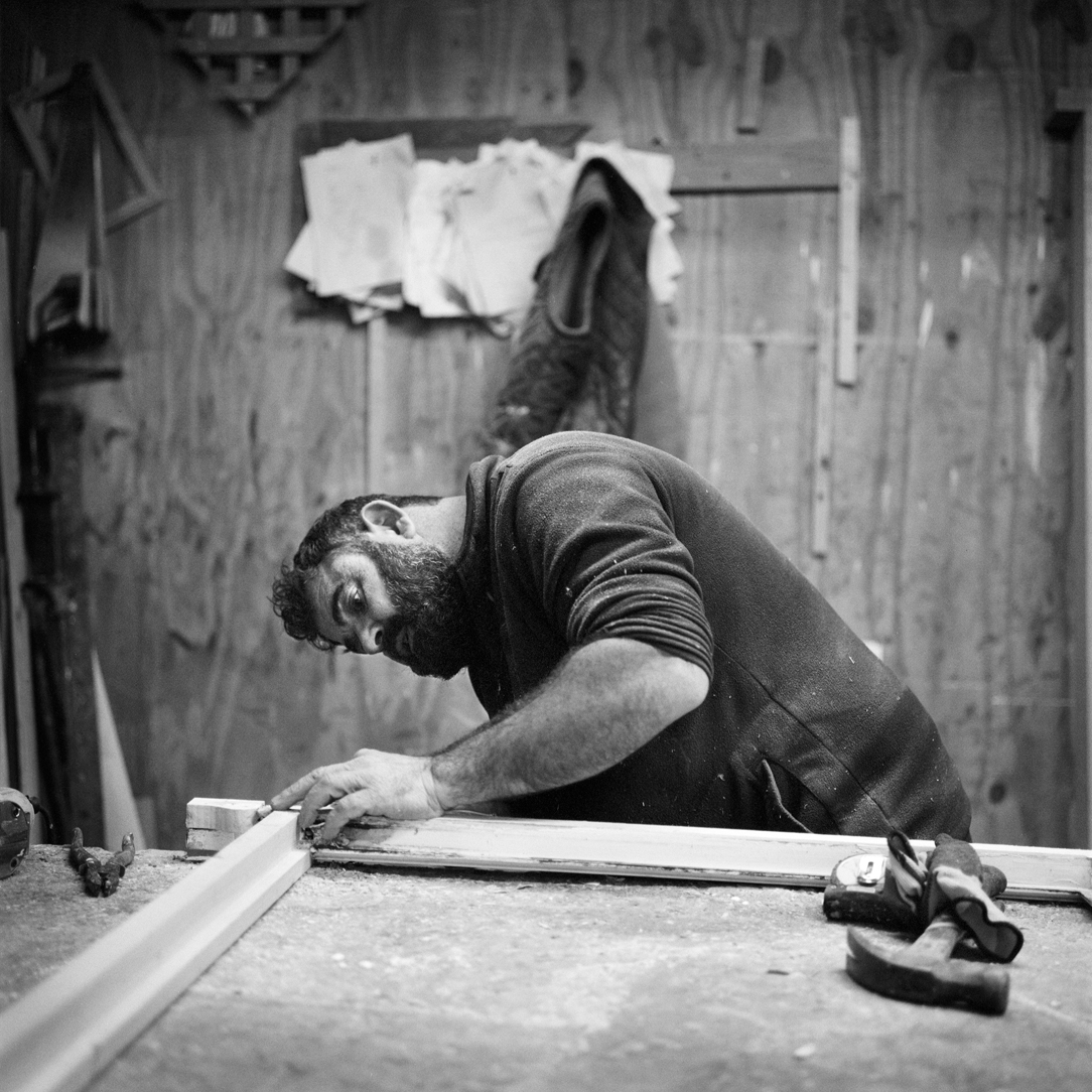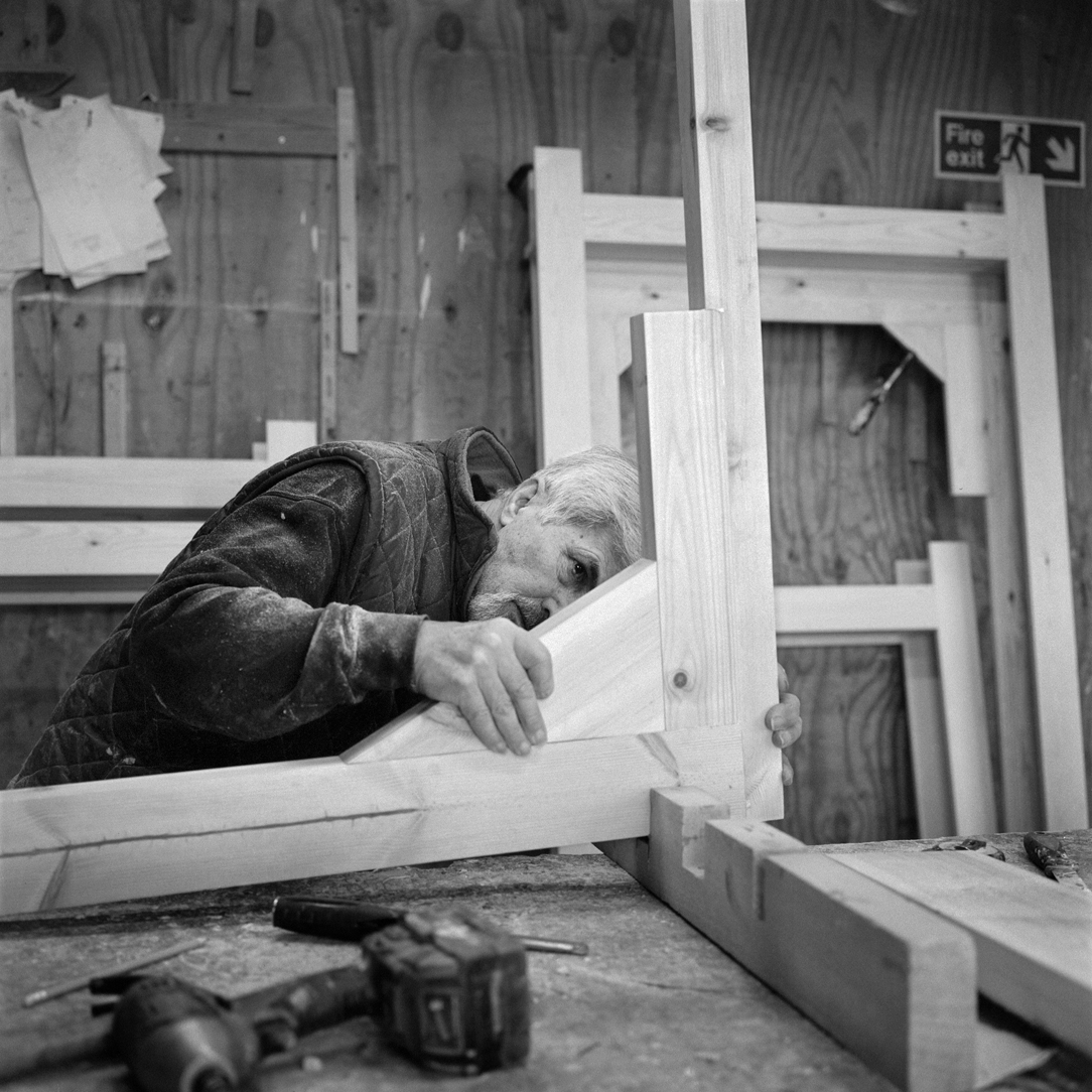 Kashif checks wood for straightness and quality as he makes up a door frame. |