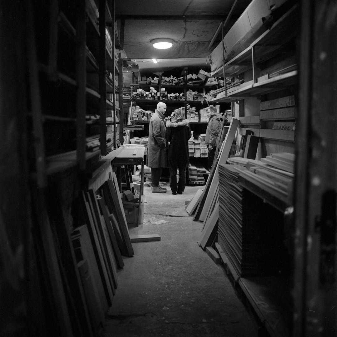 | A customer searches for the wood he needs as Faik planes wood in the rear workshop. | ||||