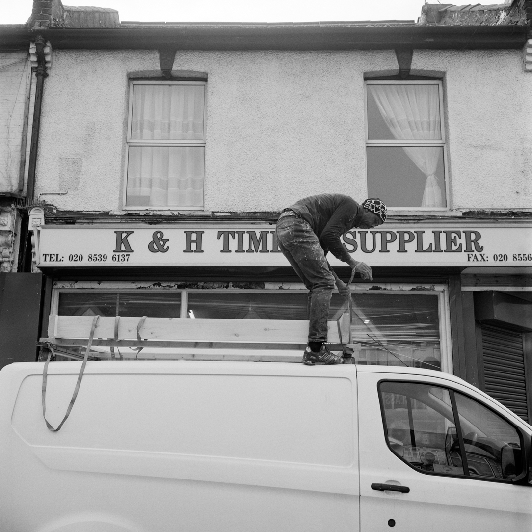 | Driver and general worker Cesim Gundaz gets into his van on Lea Bridge Road as he prepares to deliver a door and frame to a customer. | ||||
