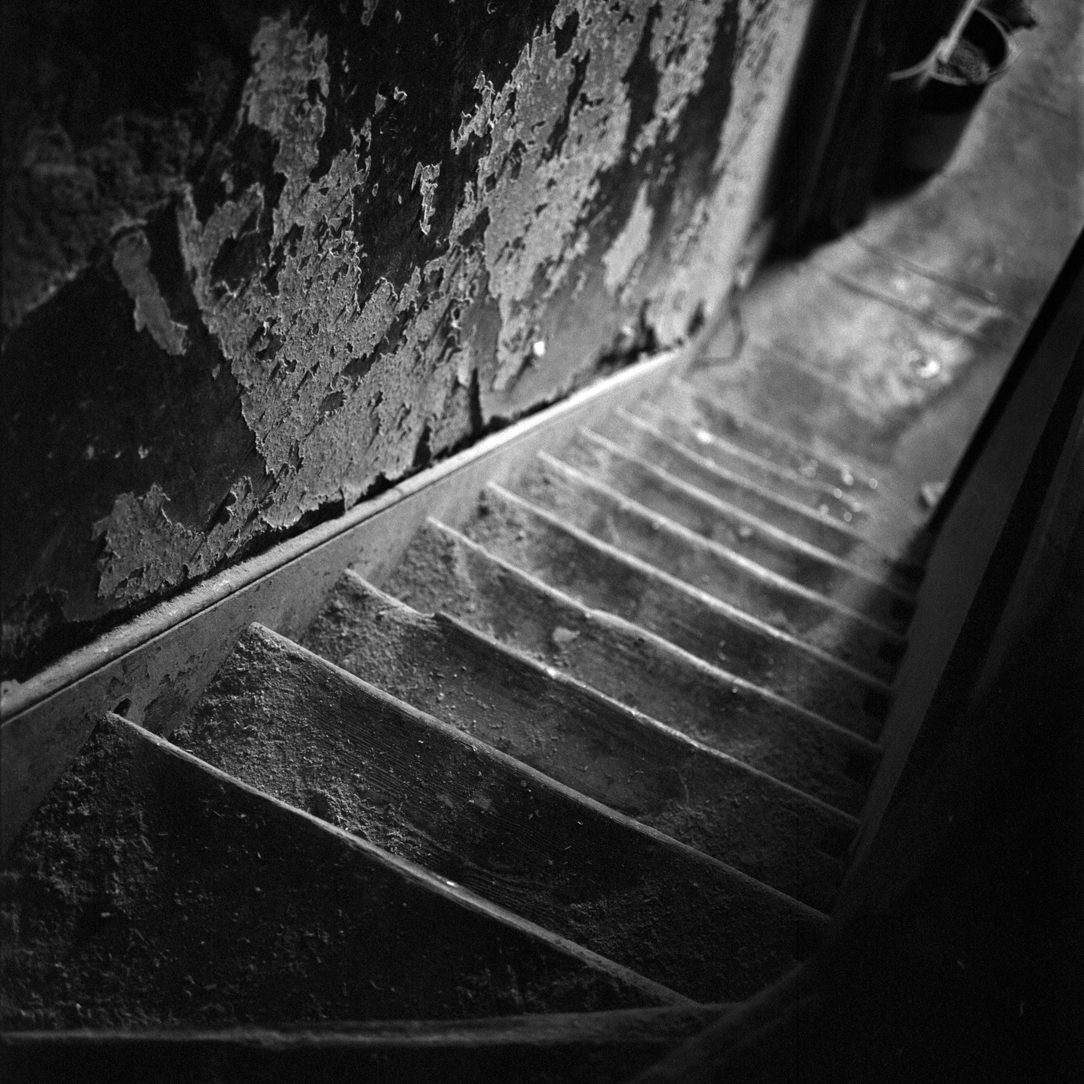 | The narrow sawdust covered stairwell that leads from the shop to the upstairs workshops. | ||||