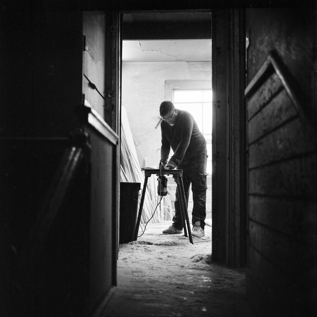 Wearing a mask to protect against a haze of fine dust and paint spray carpenter Daniel Chrostowski prepares a door for priming by filing and sanding imperfections in the wood. Daniel is one of many local tradesmen who are frequent customers and often uses the facilities and tools in the K&H Timber workshop as he is considered to be a friend. |