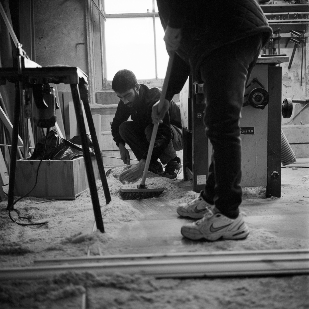 | Ayhan Jeter who is considered to be the most experienced and skilled carpenter by Ahmet and Hasan carefully hand sands a door frame in the upstairs workshop. | ||||