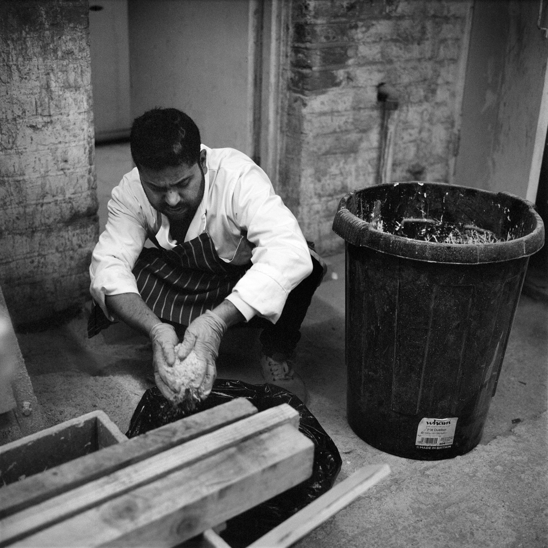 | Machinist Umer Farooq carries wood into the rear workshop to be stored. | ||||
