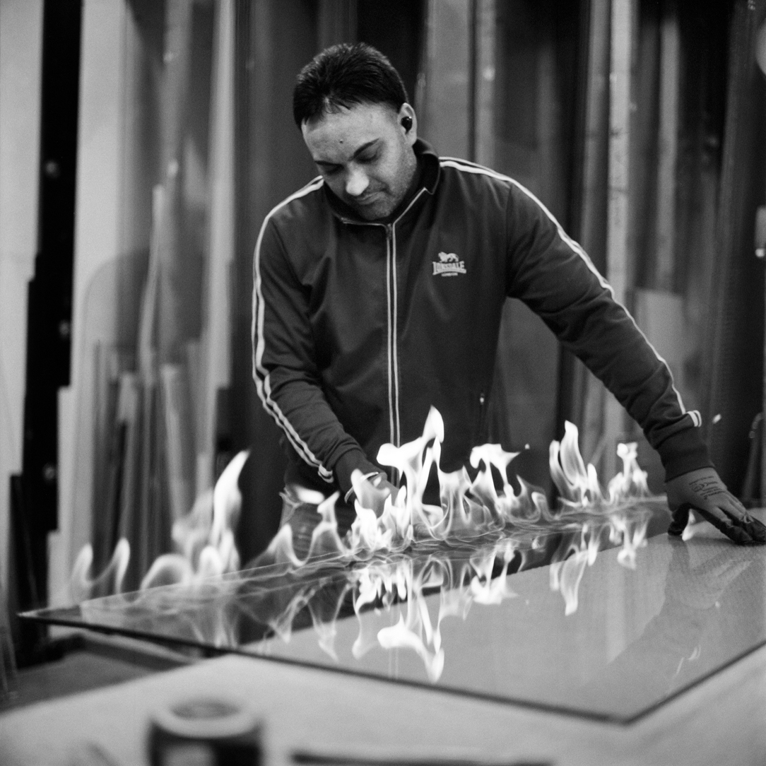 Before they are finished doors and windows need to be glazed. Jiva Singh is a glass specialist who has worked at K&H Timber Supplier for over twenty years. He has his own workshop on the ground floor and calls himself the ‘glassman’. Jiva works with all types of glass which he hand cuts to size. |