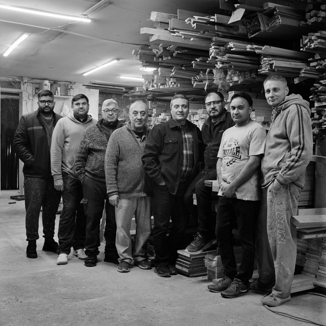 | Joint owners of K&H Timber Supplier, brothers Hasan and Ahmet Kasim (centre) stand with workers (left to right) Umer Farooq, Kashif Jazab, Cesim Gundaz, Faik Ibik, Jiva Singh and Daniel Chrostowski. | ||||