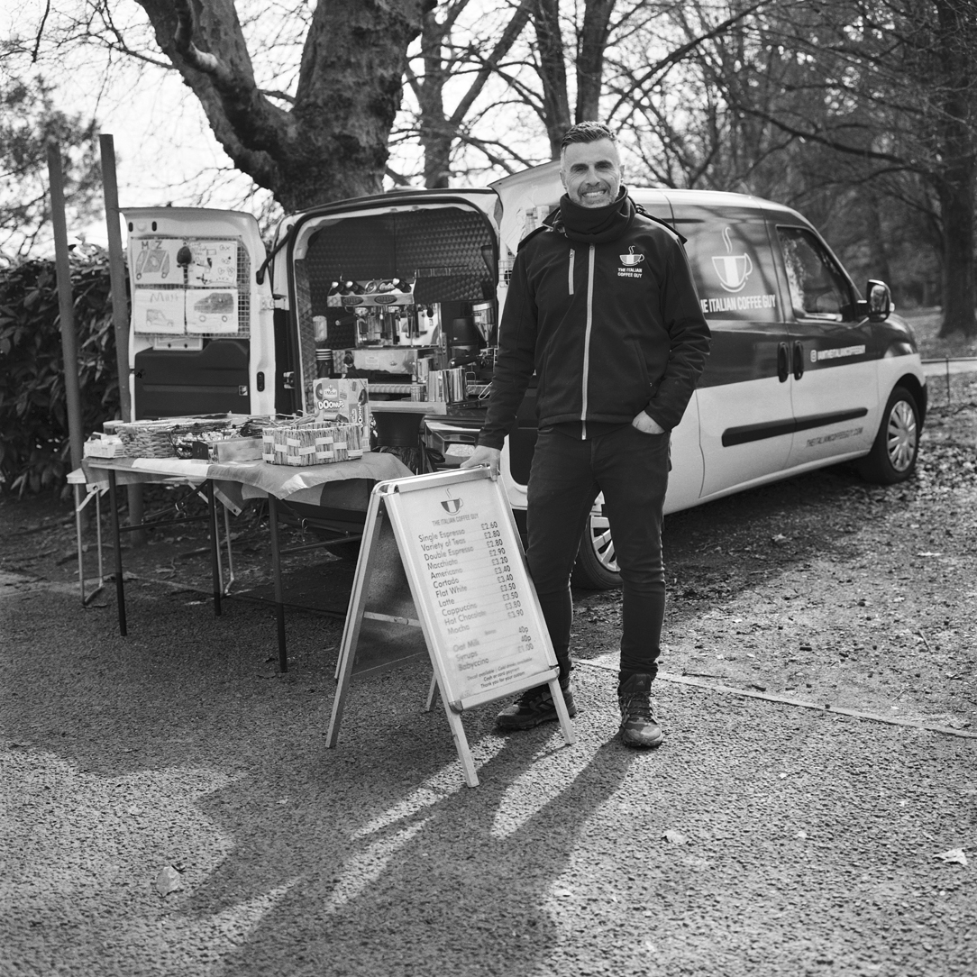 | Massimo Mazzeo, who trades as ‘The Italian Coffee Guy’ serves customers drinks in a car park in Horsham, March 20, 2026. Maz, as he likes to be known, made the decision to give up the corporate lifestyle when his father died in 2021, realising that he wanted a different life. He decided to follow his passion for coffee, went to Italy and bought a Piaggio Ape, a 3 wheeled light commercial vehicle, in January 2022 and started trading in July 2022. He says that he loves his work and the freedom it gives him, meeting people and working in the community. He added that the local Horsham council have really helped him as a small business and it’s only poor weather that he struggles with as it affects his business. |