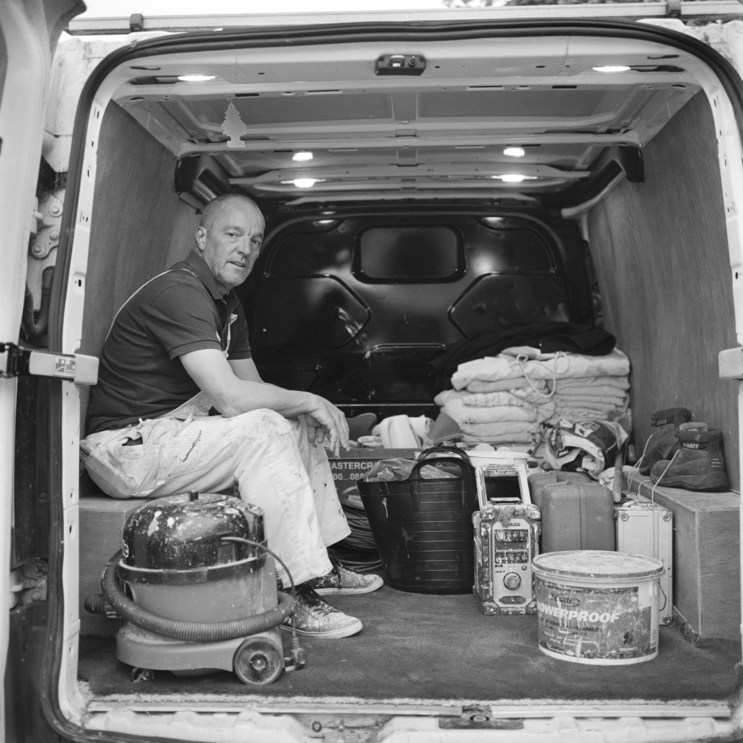 | I am continually fascinated by small business owners, the backbone of the economy. Hard working people plying their trade often from vans. The phrase ‘white van man’ was coined in 1997 and quickly popularised by the tabloids to represent the voice of the working class; often van-driving tradesmen that had negative connotations of aggression, sexism, racism and poor driving. Today this view is outdated. You’re as likely to see a women driving vans working in trade as you are a man. What interests me is how all the necessary tools of their trade are crammed into these vans. Only the van owner knows exactly where each specific tool is hidden, in what to everyone else looks like a chaotic mess. I plan an ongoing series of portraits, which means I will have to start to always carry my Rolleiflex with me, not a bad thing. |