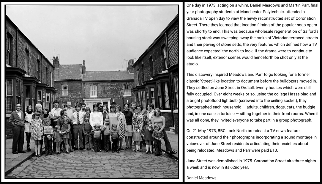 In the 1990’s I lived in Forest Gate, London. Close to my house is Curwen Avenue, a small cul-de-sac of 24 small terraced houses built between 1900 and 1929. Each time I walked past it I thought of the picture series shot jointly by Daniel Meadows and Martin Parr in 1973, titled June Street. A simple idea, the best ones always are, they photographed each family in their front room. With a nod of respect, I hope to do the same in Curwen Street. Not sure if it will be in colour or black and white, probabaly both if I get access. Click on the picture above to get a feel for the story as I work my way into it. |
