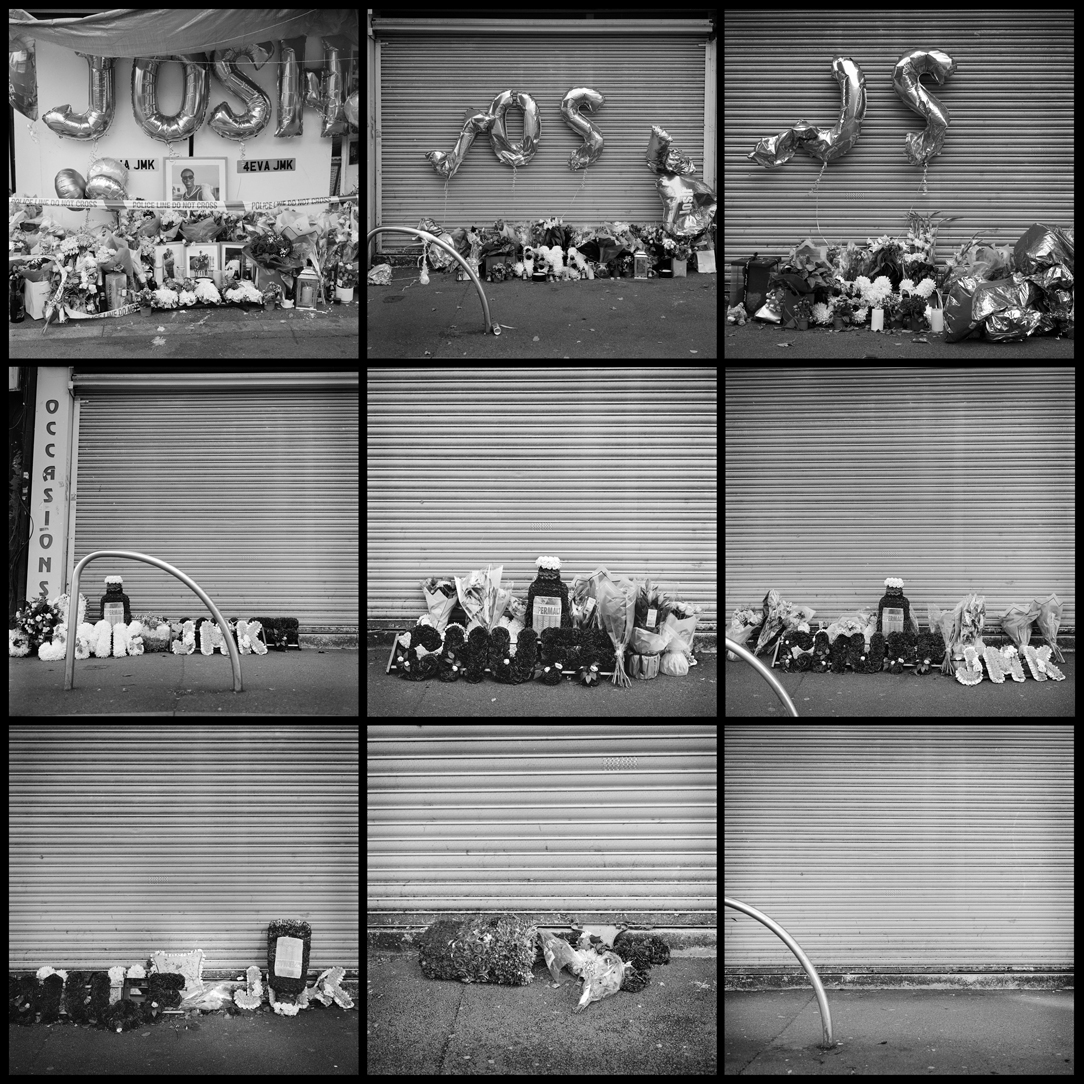 May 1, 2025, in the Old Bailey the trial of Renai Belle and two others charged in relation to the murder of father of two Josh McKay, 33, starts. Josh, was stabbed in the neck on Lwhile getting his hair cut on Lea Bridge Road, on the afternoon of July 6, 2024 and died of the single stab wound. A temporary memorial of flowers, pictures, balloons and other personal tributes were put up by friends and family at the scene. As the weeks and months passed, I have documented this memorial as part of my ongoing project that examines the slow changes taking place in this community. I have created a combination image of nine pictures, shot over nearly a year, puling this transformation together. The memorial was finally cleared in February, for me a sad and poignant transition. My thoughts are with Josh’s family and loved ones. |