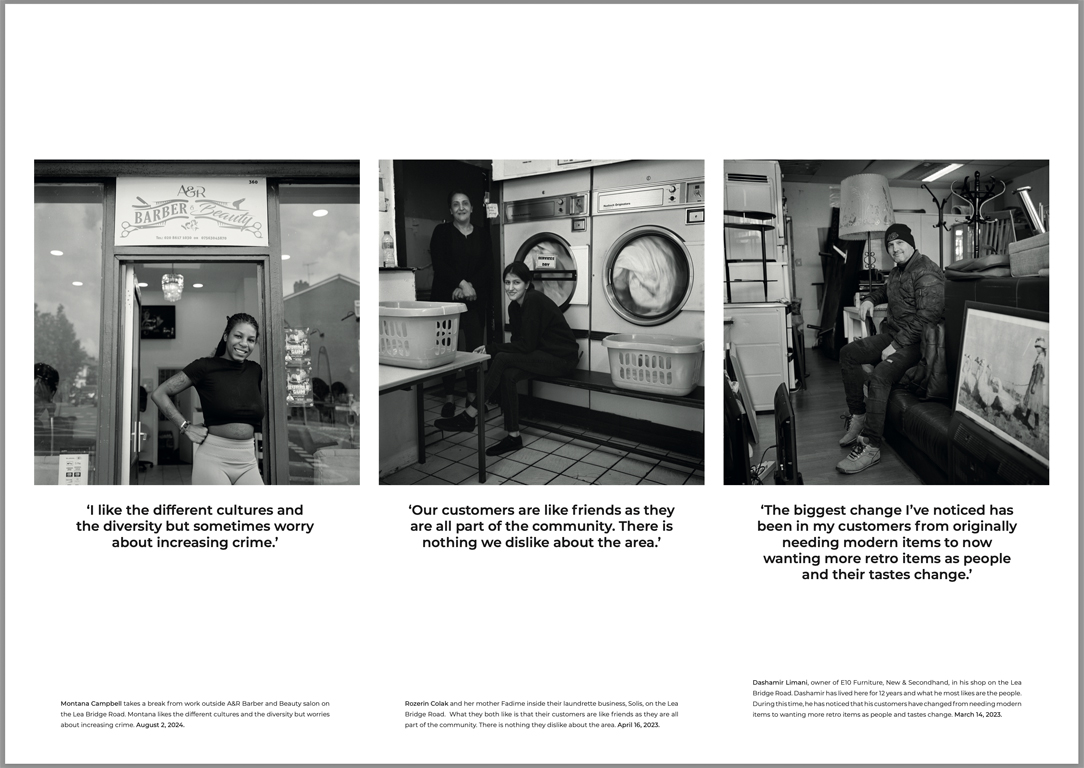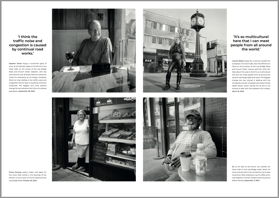 As a documentarian I wanted to photograph people who belong to this community, listen to their stories, ask them what they most like about the Lea Bridge Road and what changes they had noticed. To create a comfortable negotiated space to take pictures, I use vintage cameras, shooting black and white film. I then record the opinions of those photographed to capture their voices and thoughts. I’ve also tried to ensure that everyone I photographed have been given a free print. The goal is to create a body of work that offers future generations an insight into the community of people living and working on the Lea Bridge Road, who might otherwise go unheard and unseen.