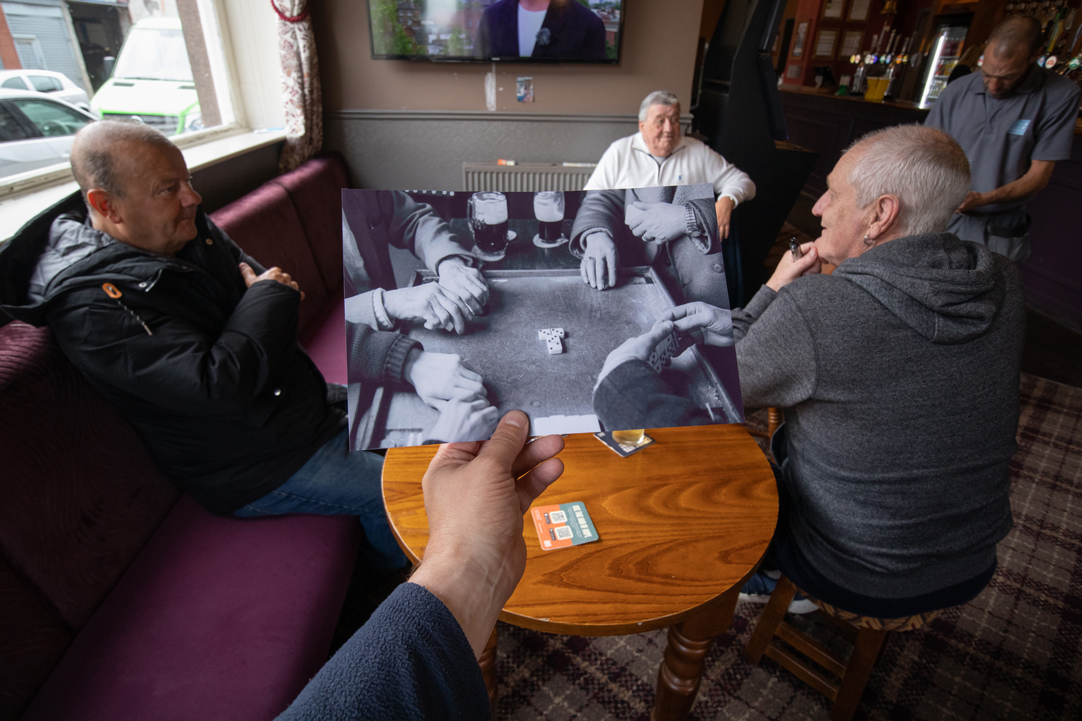 The Star & Garter pub is sited on the corner of Hessle Road and West Dock Avenue and was once the centre of Hull’s fishing community. For years it was known locally as Rayners, nick-named such after it’s larger-than-life 1930’s landlord, Henry Rayner. It was the traditional meeting and drinking place of deep sea trawler-men, who worked three weeks at sea and then came home onshore for just three days. As the fishing industry declined, so did the fortunes of the Star & Garter. In 1983 the majority of lunchtime drinkers were old, retired or unemployed fishermen, their wives and widows. The bar was always filled with smoke as customers drank their pints, enjoying the company of others and telling or re-telling old stories of fishing and fishermen. It was during this time that I spent many lunchtimes taking pictures. Today, the Star & Garter’s doors are still open for drinks, family events, live music and organised celebration nights. The pub’s name has been officially changed to Rayners but its sense of belonging to the traditions of the fishing community are still strong. In 2022 I revisited the Star & Garter. I took prints of the original 1983 images into the pub over several lunchtimes, holding them in the exact same position they were originally taken. The drinkers of 1983 appear ghostlike in today’s world for a quick chat, laugh and pint. A big thank-you to Paul Heaton who has given me permission to use The Housemartins song ‘Think For A Minute’ as the soundtrack for this story. Click on the picture to see the video and soundtrack story. To see the still pictures click here. |